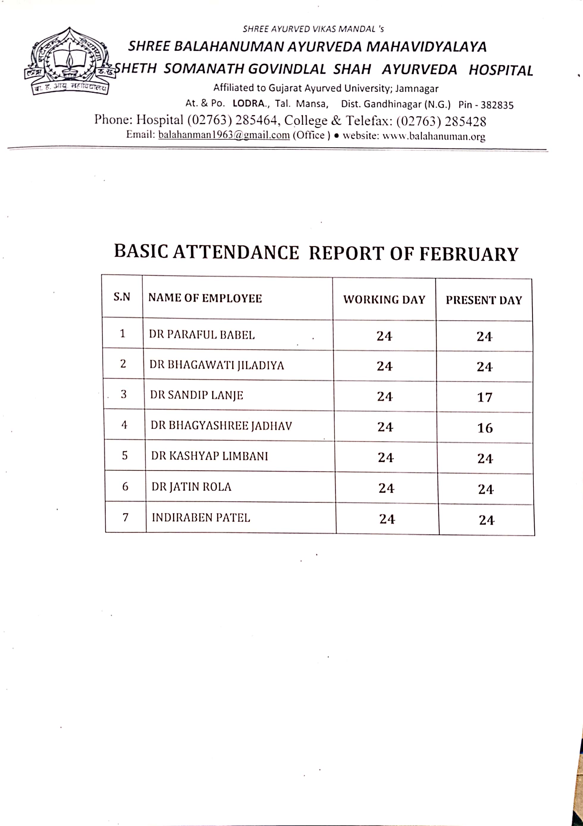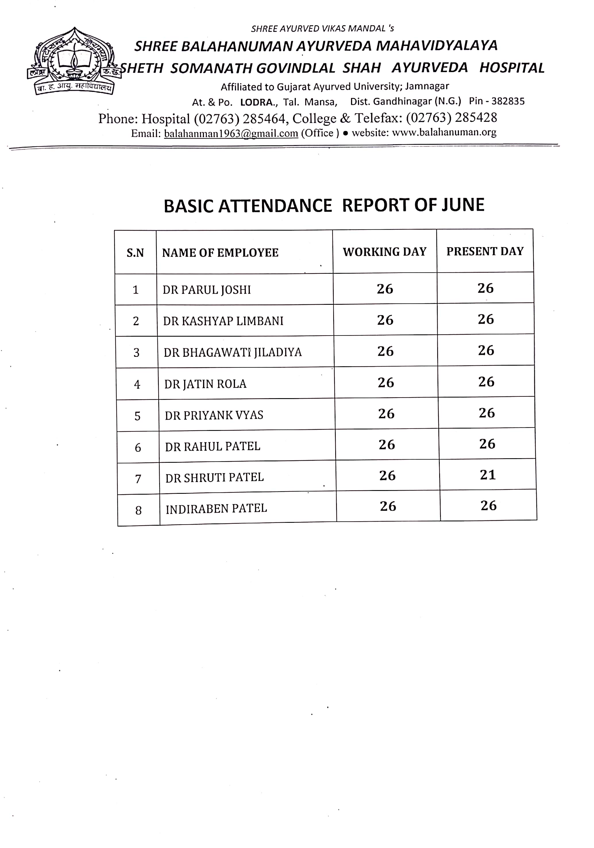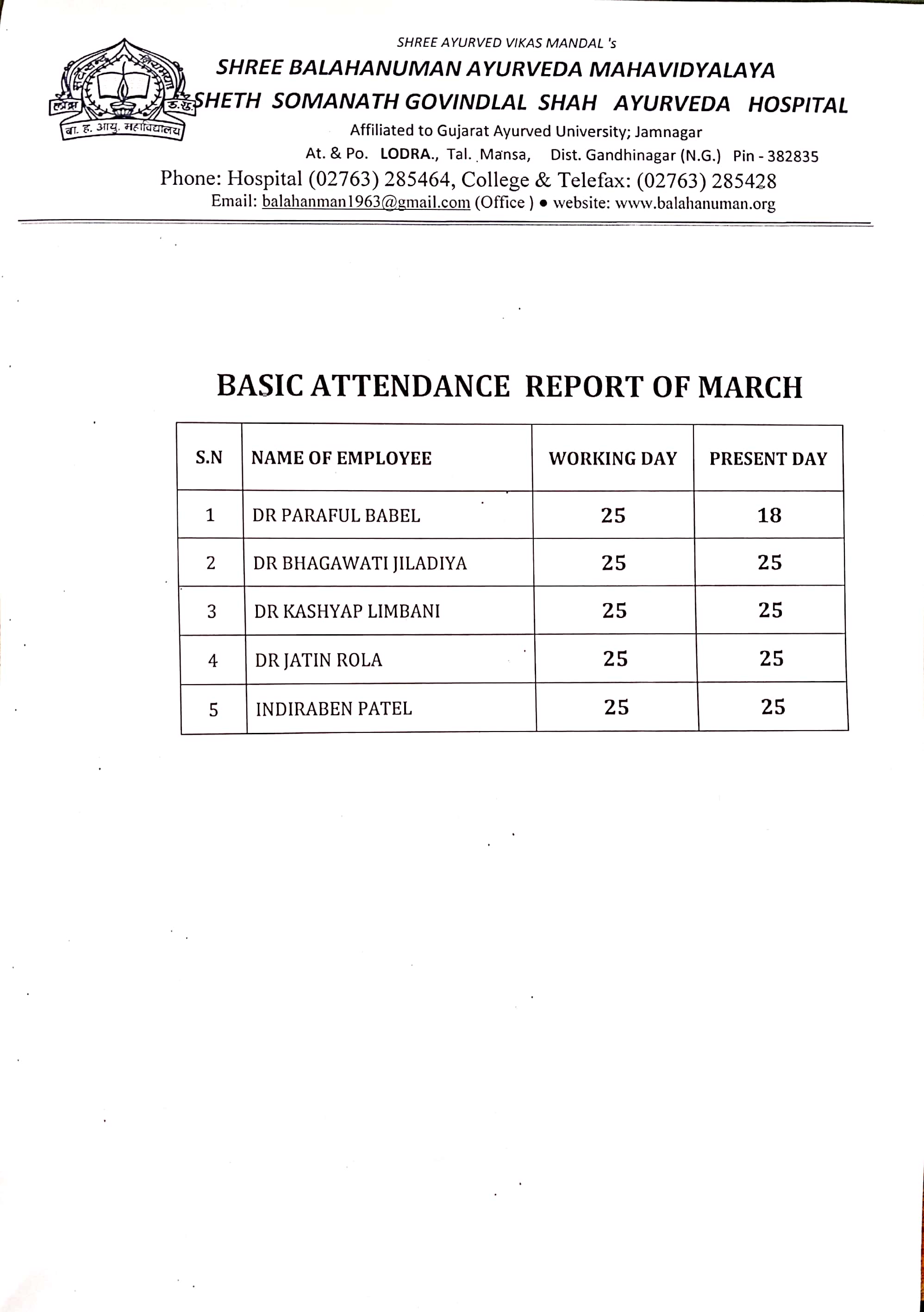 Teaching Staff Attendance (Monthwise) of Shree Balahanuman Ayurved Mahavidyalaya