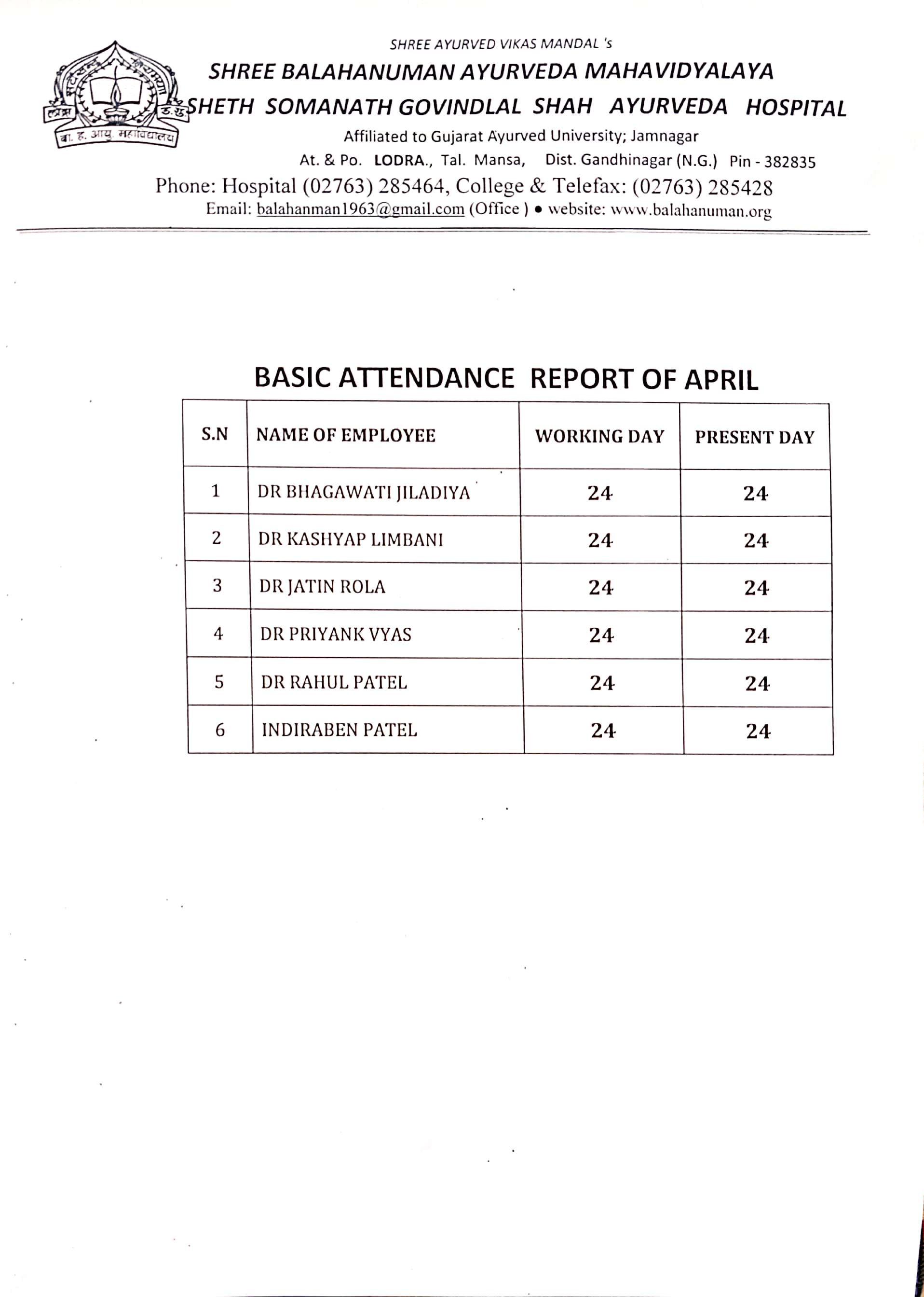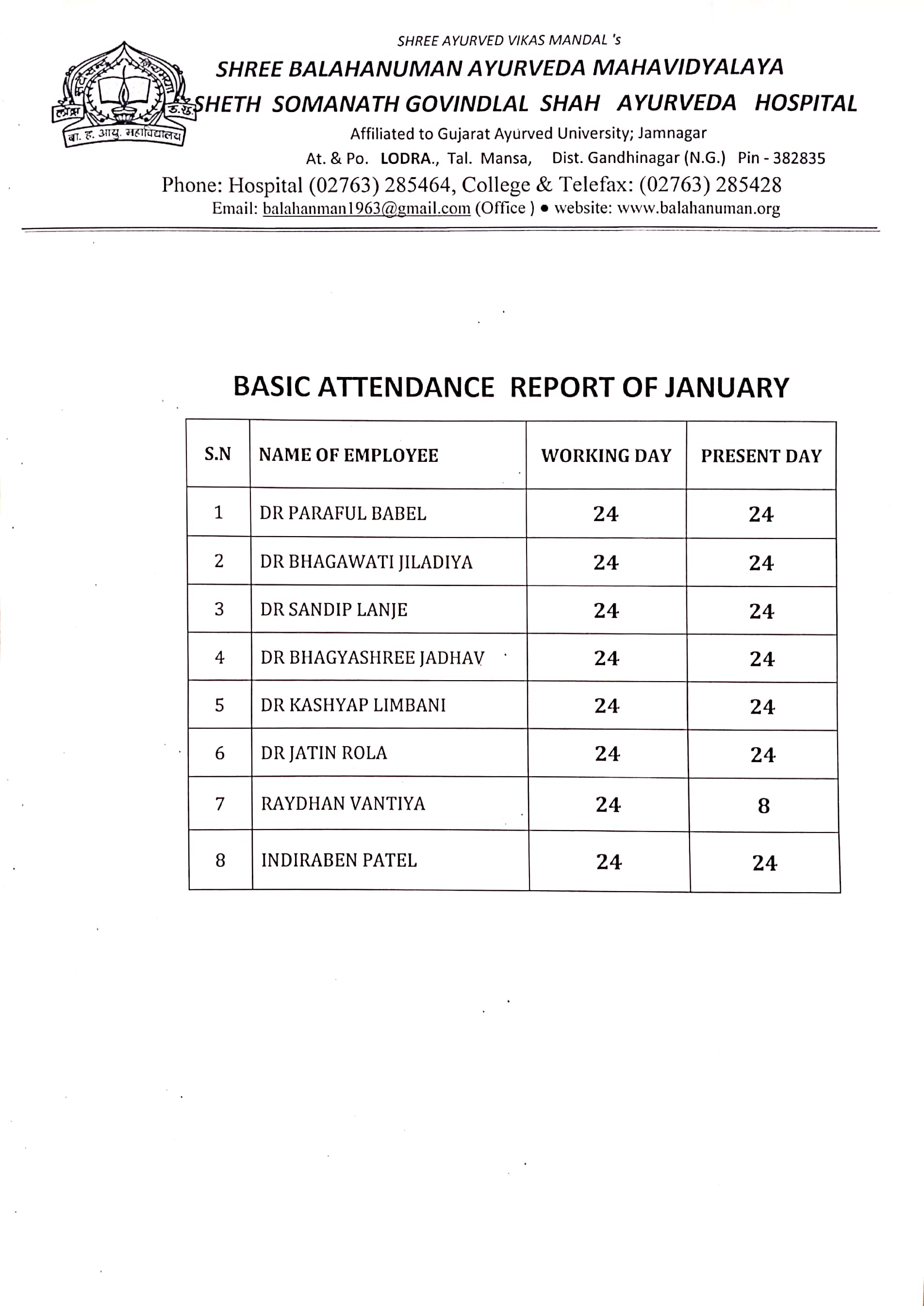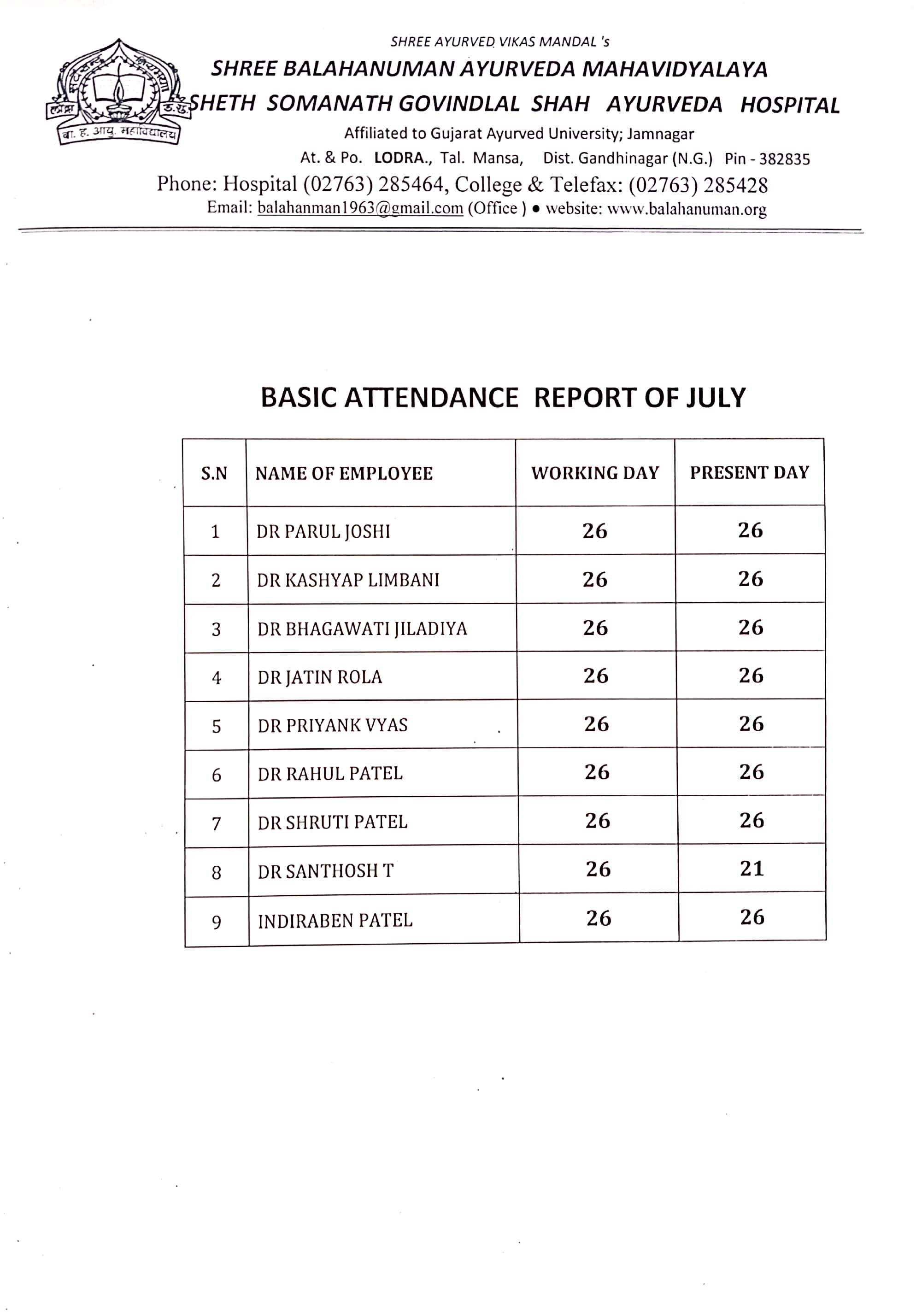 Teaching Staff Attendance (Monthwise) of Shree Balahanuman Ayurved Mahavidyalaya
